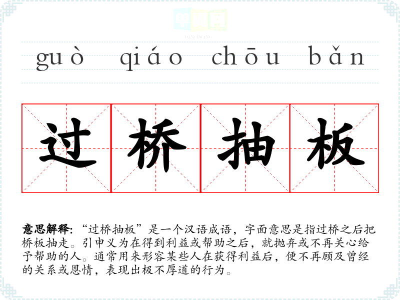 “过桥抽板”是一个汉语成语,字面意思是指过桥之后把桥板抽走。引申义为在得到利益或帮助之后,就抛弃或不再关心给予帮助的人。通常用来形容某些人在获得利益后,便不再顾及曾经的关系或恩情,表现出极不厚道的行为。
