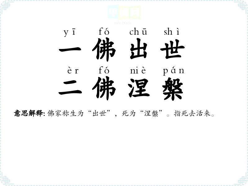 | 一佛升天,二佛出世 | 升天:死亡;出世:生。佛出生又死去。指活过来又死去 |