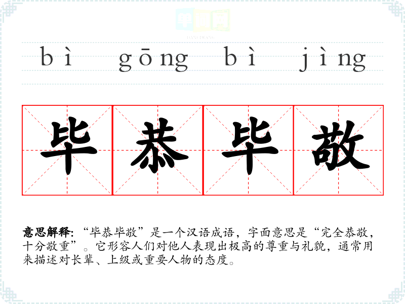 “毕恭毕敬”是一个汉语成语,字面意思是“完全恭敬,十分敬重”。它形容人们对他人表现出极高的尊重与礼貌,通常用来描述对长辈、上级或重要人物的态度。