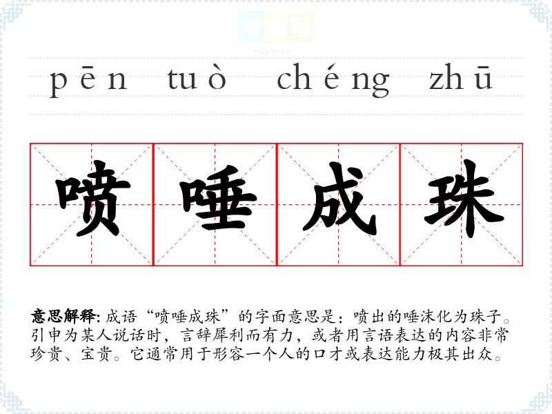 成语“喷唾成珠”的字面意思是:喷出的唾沫化为珠子。引申为某人说话时,言辞犀利而有力,或者用言语表达的内容非常珍贵、宝贵。它通常用于形容一个人的口才或表达能力极其出众。