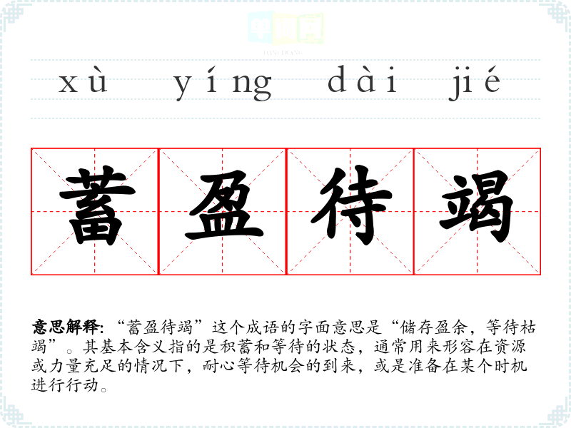 “蓄盈待竭”这个成语的字面意思是“储存盈余,等待枯竭”。其基本含义指的是积蓄和等待的状态,通常用来形容在资源或力量充足的情况下,耐心等待机会的到来,或是准备在某个时机进行行动。
