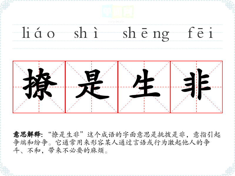 “撩是生非”这个成语的字面意思是挑拨是非,意指引起争端和纷争。它通常用来形容某人通过言语或行为激起他人的争斗、不和,带来不必要的麻烦。