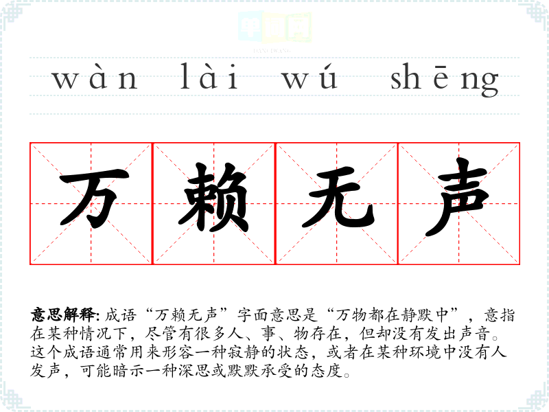 成语“万赖无声”字面意思是“万物都在静默中”,意指在某种情况下,尽管有很多人、事、物存在,但却没有发出声音。这个成语通常用来形容一种寂静的状态,或者在某种环境中没有人发声,可能暗示一种深思或默默承受的态度。