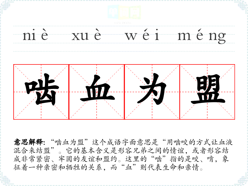 “啮血为盟”这个成语字面意思是“用啮咬的方式让血液混合来结盟”。它的基本含义是形容兄弟之间的情谊,或者形容结成非常紧密、牢固的友谊和盟约。这里的“啮”指的是咬、啃,象征着一种亲密和牺牲的关系,而“血”则代表生命和亲情。