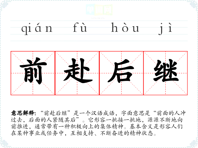 “前赴后继”是一个汉语成语,字面意思是“前面的人冲过去,后面的人紧随其后”。它形容一批接一批地,源源不断地向前推进,通常带有一种积极向上的集体精神。基本含义是形容人们在某种事业或任务中,互相支持、不断奋进的精神状态。