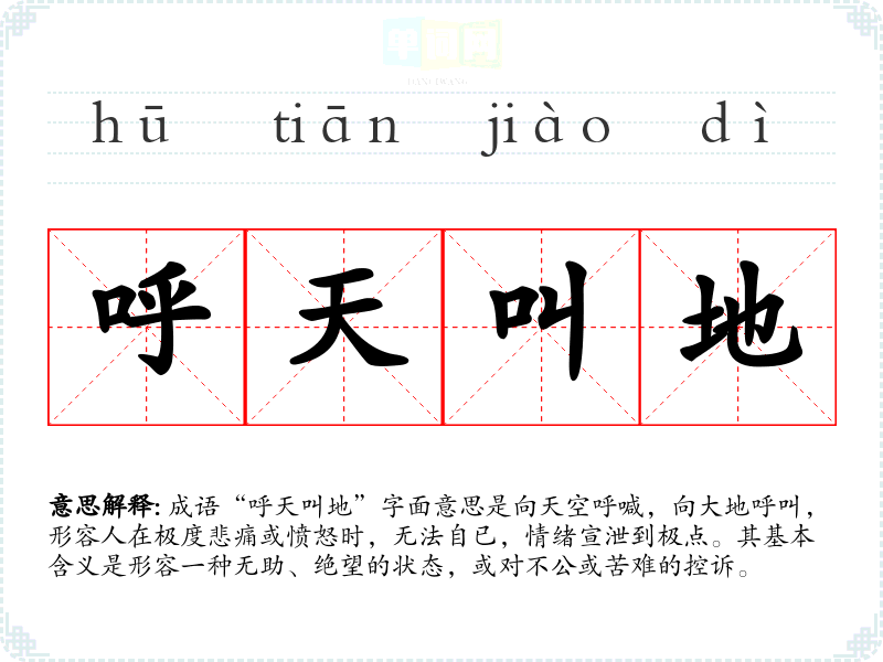 成语“呼天叫地”字面意思是向天空呼喊,向大地呼叫,形容人在极度悲痛或愤怒时,无法自已,情绪宣泄到极点。其基本含义是形容一种无助、绝望的状态,或对不公或苦难的控诉。