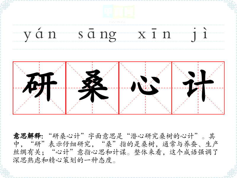 “研桑心计”字面意思是“潜心研究桑树的心计”。其中,“研”表示仔细研究,“桑”指的是桑树,通常与养蚕、生产丝绸有关;“心计”意指心思和计谋。整体来看,这个成语强调了深思熟虑和精心策划的一种态度。