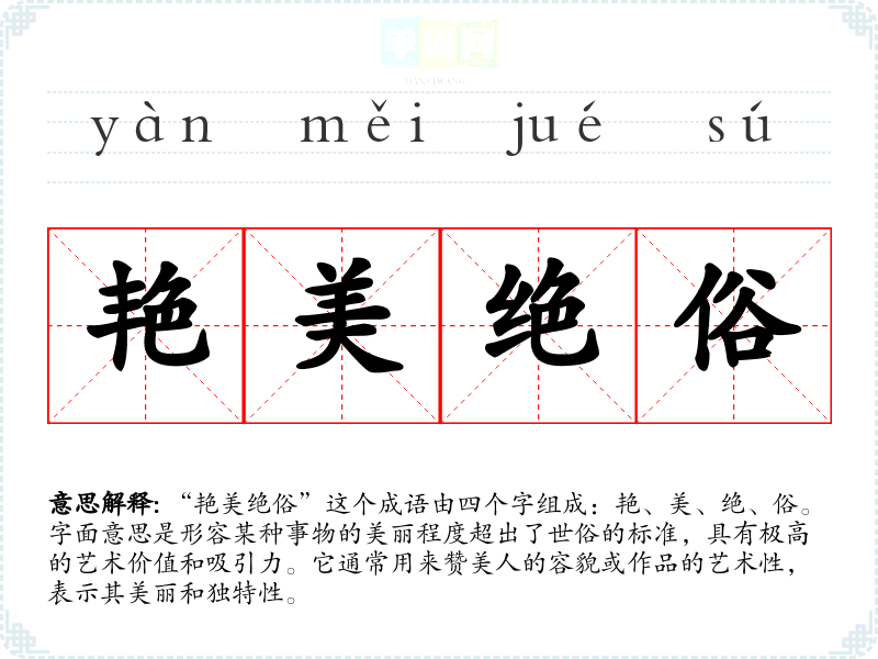 “艳美绝俗”这个成语由四个字组成:艳、美、绝、俗。字面意思是形容某种事物的美丽程度超出了世俗的标准,具有极高的艺术价值和吸引力。它通常用来赞美人的容貌或作品的艺术性,表示其美丽和独特性。