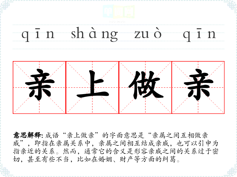 成语“亲上做亲”的字面意思是“亲属之间互相做亲戚”,即指在亲属关系中,亲属之间相互结成亲戚,也可以引申为指亲近的关系。然而,通常它的含义是形容亲戚之间的关系过于密切,甚至有些不当,比如在婚姻、财产等方面的纠葛。