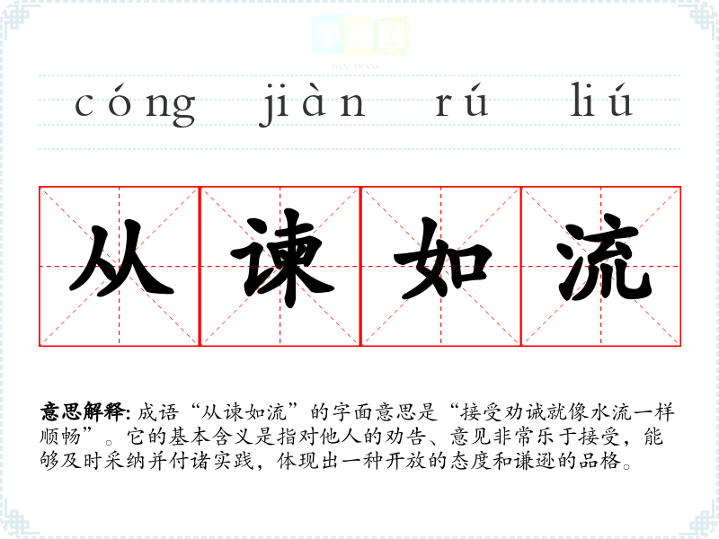 成语“从谏如流”的字面意思是“接受劝诫就像水流一样顺畅”。它的基本含义是指对他人的劝告、意见非常乐于接受,能够及时采纳并付诸实践,体现出一种开放的态度和谦逊的品格。