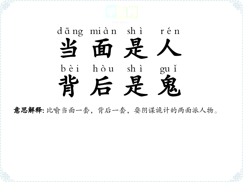 | 人前背后 | 当着人背着人。当面一套背后一套。 |