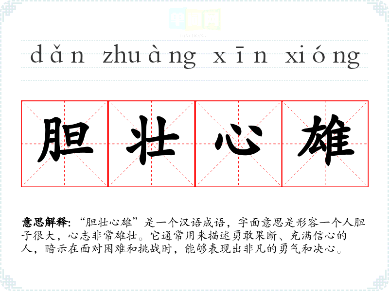 “胆壮心雄”是一个汉语成语,字面意思是形容一个人胆子很大,心志非常雄壮。它通常用来描述勇敢果断、充满信心的人,暗示在面对困难和挑战时,能够表现出非凡的勇气和决心。