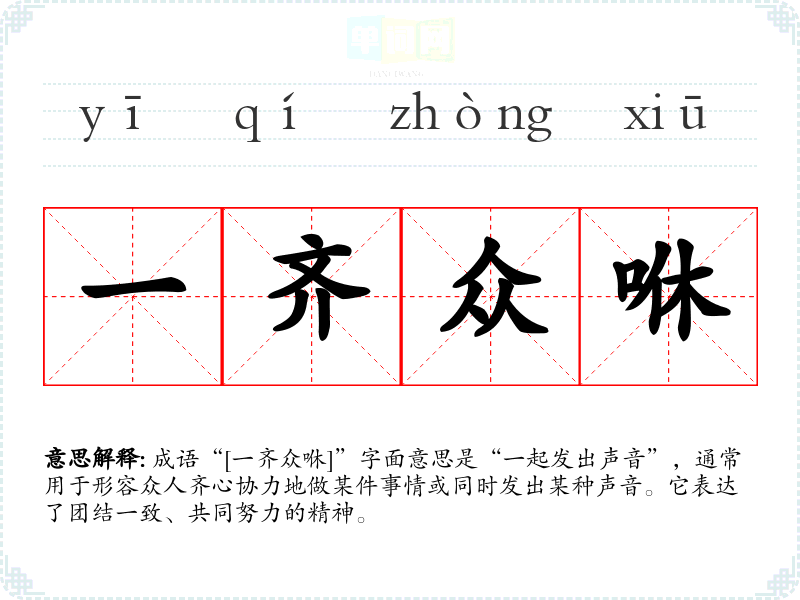 成语“[一齐众咻]”字面意思是“一起发出声音”,通常用于形容众人齐心协力地做某件事情或同时发出某种声音。它表达了团结一致、共同努力的精神。