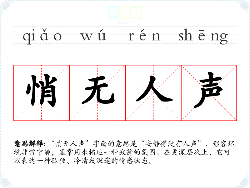 “悄无人声”字面的意思是“安静得没有人声”,形容环境非常宁静,通常用来描述一种寂静的氛围。在更深层次上,它可以表达一种孤独、冷清或深邃的情感状态。