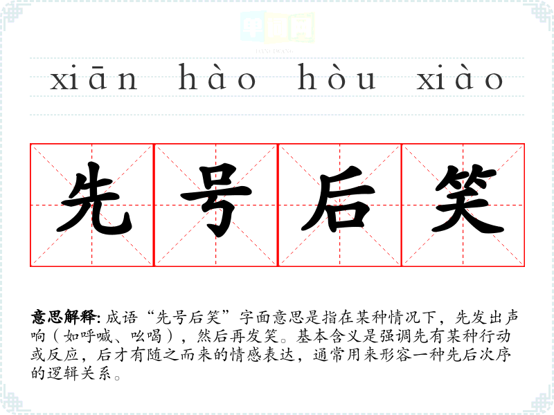 成语“先号后笑”字面意思是指在某种情况下,先发出声响(如呼喊、吆喝),然后再发笑。基本含义是强调先有某种行动或反应,后才有随之而来的情感表达,通常用来形容一种先后次序的逻辑关系。