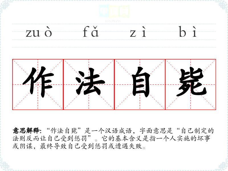 | 作法自毙 | 自己立法反而使自己受害。泛指自做自受。 |