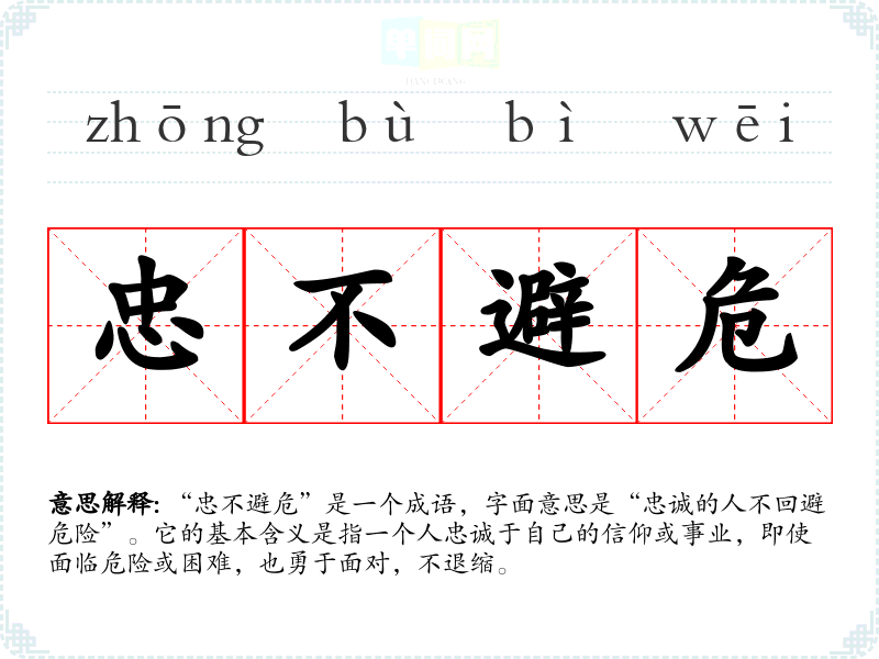 “忠不避危”是一个成语,字面意思是“忠诚的人不回避危险”。它的基本含义是指一个人忠诚于自己的信仰或事业,即使面临危险或困难,也勇于面对,不退缩。