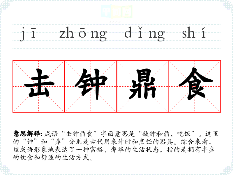 成语“击钟鼎食”字面意思是“敲钟和鼎,吃饭”。这里的“钟”和“鼎”分别是古代用来计时和烹饪的器具。综合来看,该成语形象地表达了一种富裕、奢华的生活状态,指的是拥有丰盛的饮食和舒适的生活方式。