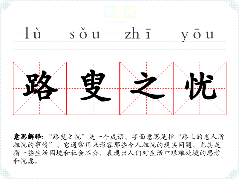 “路叟之忧”是一个成语,字面意思是指“路上的老人所担忧的事情”。它通常用来形容那些令人担忧的现实问题,尤其是指一些生活困境和社会不公,表现出人们对生活中艰难处境的思考和忧虑。