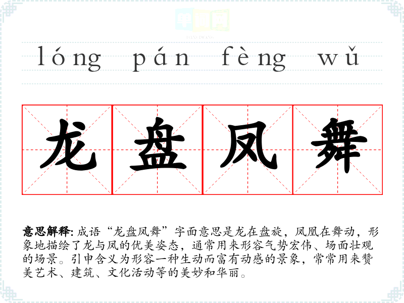 在**传统文化中,龙和凤是权力和美丽的象征。成语“龙盘凤舞”不仅体现了对美的追求,也反映了人们对和谐与繁荣的向往。在现代社会,这个成语仍然适用于各种描述,比如在各种艺术展览、表演及庆典活动中。