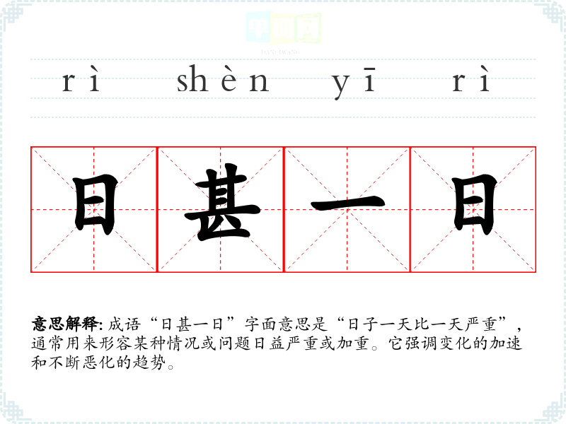 成语“日甚一日”字面意思是“日子一天比一天严重”,通常用来形容某种情况或问题日益严重或加重。它强调变化的加速和不断恶化的趋势。