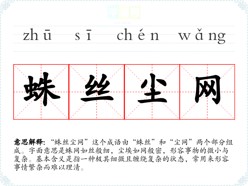 “蛛丝尘网”这个成语由“蛛丝”和“尘网”两个部分组成。字面意思是蛛网如丝般细,尘埃如网般密,形容事物的微小与复杂。基本含义是指一种极其细微且缠绕复杂的状态,常用来形容事情繁杂而难以理清。