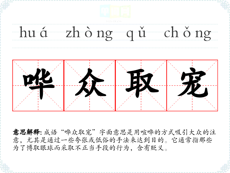成语“哗众取宠”字面意思是用喧哗的方式吸引大众的注意,尤其是通过一些夸张或低俗的手法来达到目的。它通常指那些为了博取眼球而采取不正当手段的行为,含有贬义。