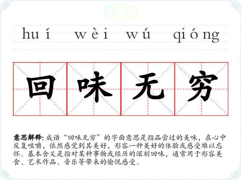 | 回味无穷 | 回味:指吃过东西以后的余味。比喻回想某一事物,越想越觉得有意思。 |