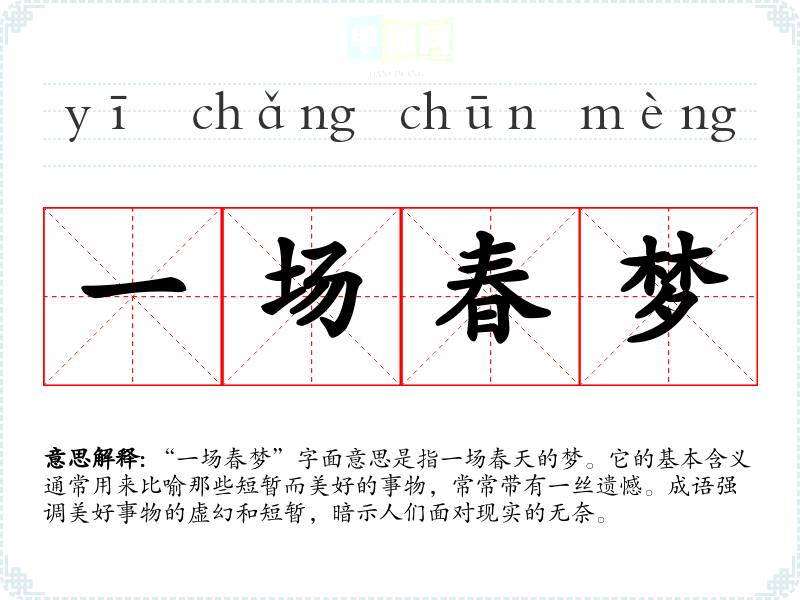 “一场春梦”字面意思是指一场春天的梦。它的基本含义通常用来比喻那些短暂而美好的事物,常常带有一丝遗憾。成语强调美好事物的虚幻和短暂,暗示人们面对现实的无奈。