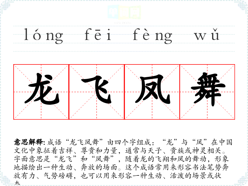 “龙飞凤舞”最早出现在南朝的《文心雕龙》中,其中提到书法的表现力。这个成语不仅与书法相关,还反映了古代文人对笔墨的追求与审美。它强调了艺术创作中的自由与激情,表达了对优雅与力量的向往。
