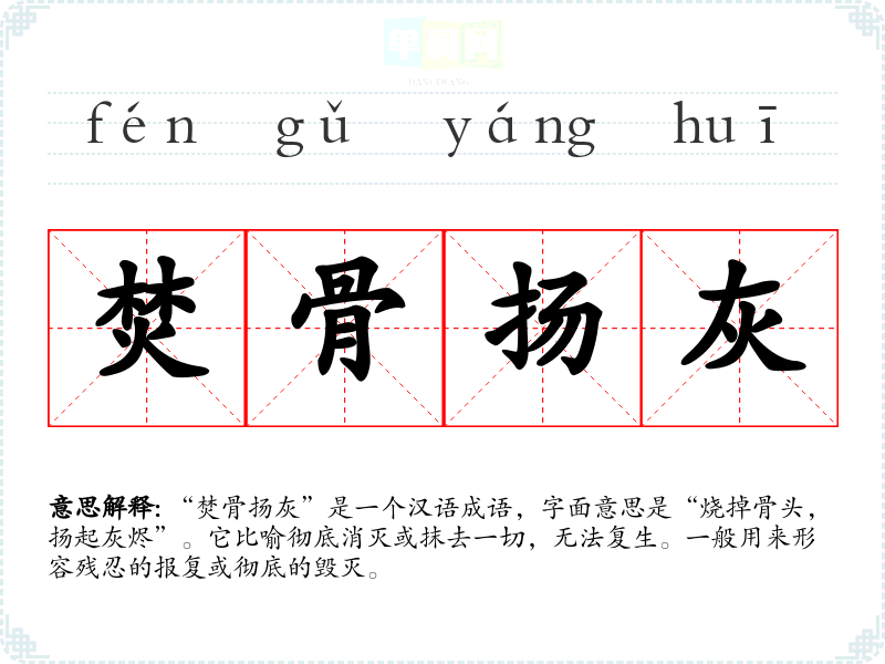 “焚骨扬灰”是一个汉语成语,字面意思是“烧掉骨头,扬起灰烬”。它比喻彻底消灭或抹去一切,无法复生。一般用来形容残忍的报复或彻底的毁灭。