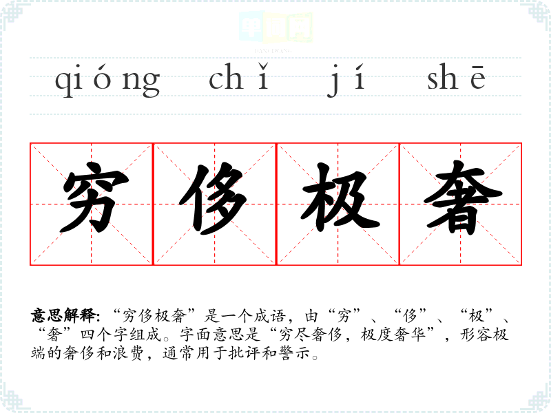 “穷侈极奢”是一个成语,由“穷”、“侈”、“极”、“奢”四个字组成。字面意思是“穷尽奢侈,极度奢华”,形容极端的奢侈和浪费,通常用于批评和警示。