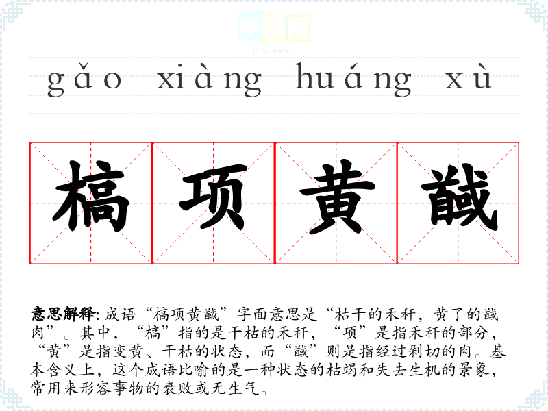 成语“槁项黄馘”字面意思是“枯干的禾秆,黄了的馘肉”。其中,“槁”指的是干枯的禾秆,“项”是指禾秆的部分,“黄”是指变黄、干枯的状态,而“馘”则是指经过剁切的肉。基本含义上,这个成语比喻的是一种状态的枯竭和失去生机的景象,常用来形容事物的衰败或无生气。