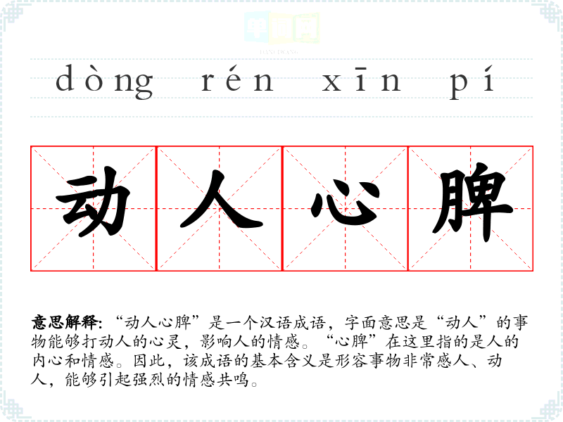 “动人心脾”是一个汉语成语,字面意思是“动人”的事物能够打动人的心灵,影响人的情感。“心脾”在这里指的是人的内心和情感。因此,该成语的基本含义是形容事物非常感人、动人,能够引起强烈的情感共鸣。
