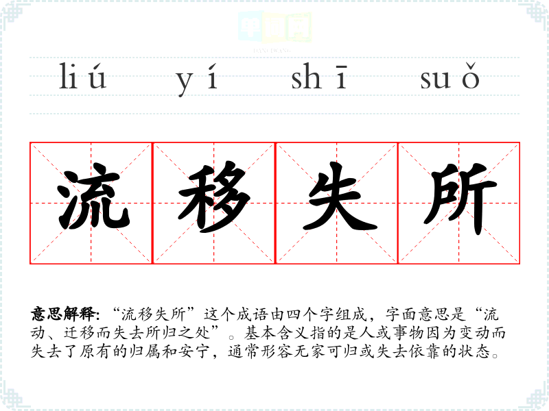 “流移失所”这个成语由四个字组成,字面意思是“流动、迁移而失去所归之处”。基本含义指的是人或事物因为变动而失去了原有的归属和安宁,通常形容无家可归或失去依靠的状态。