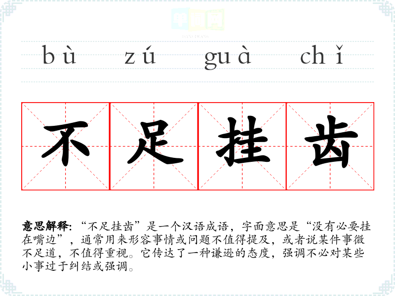 “不足挂齿”是一个汉语成语,字面意思是“没有必要挂在嘴边”,通常用来形容事情或问题不值得提及,或者说某件事微不足道,不值得重视。它传达了一种谦逊的态度,强调不必对某些小事过于纠结或强调。