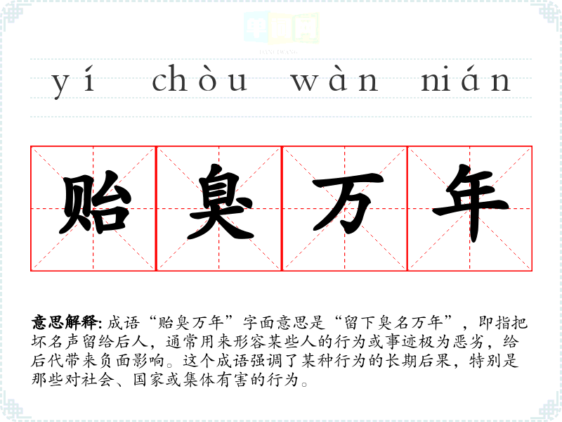 成语“贻臭万年”字面意思是“留下臭名万年”,即指把坏名声留给后人,通常用来形容某些人的行为或事迹极为恶劣,给后代带来负面影响。这个成语强调了某种行为的长期后果,特别是那些对社会、国家或集体有害的行为。