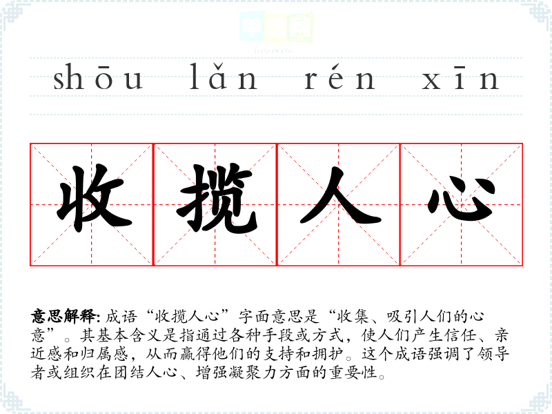 成语“收揽人心”字面意思是“收集、吸引人们的心意”。其基本含义是指通过各种手段或方式,使人们产生信任、亲近感和归属感,从而赢得他们的支持和拥护。这个成语强调了领导者或组织在团结人心、增强凝聚力方面的重要性。