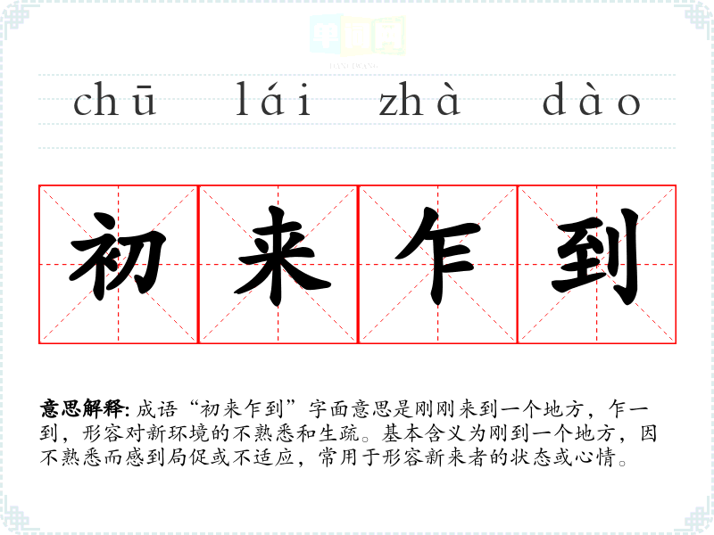 成语“初来乍到”字面意思是刚刚来到一个地方,乍一到,形容对新环境的不熟悉和生疏。基本含义为刚到一个地方,因不熟悉而感到局促或不适应,常用于形容新来者的状态或心情。