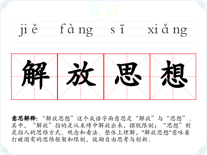 “解放思想”这个成语字面意思是“解放”与“思想”。其中,“解放”指的是从束缚中解放出来,摆脱限制;“思想”则是指人的思维方式、观念和看法。整体上理解,"解放思想"意味着打破固有的思维框架和限制,鼓励自由思考与创新。
