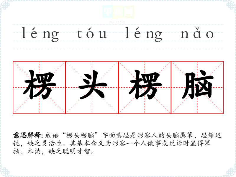 成语“楞头楞脑”字面意思是形容人的头脑愚笨,思维迟钝,缺乏灵活性。其基本含义为形容一个人做事或说话时显得笨拙、木讷,缺乏聪明才智。