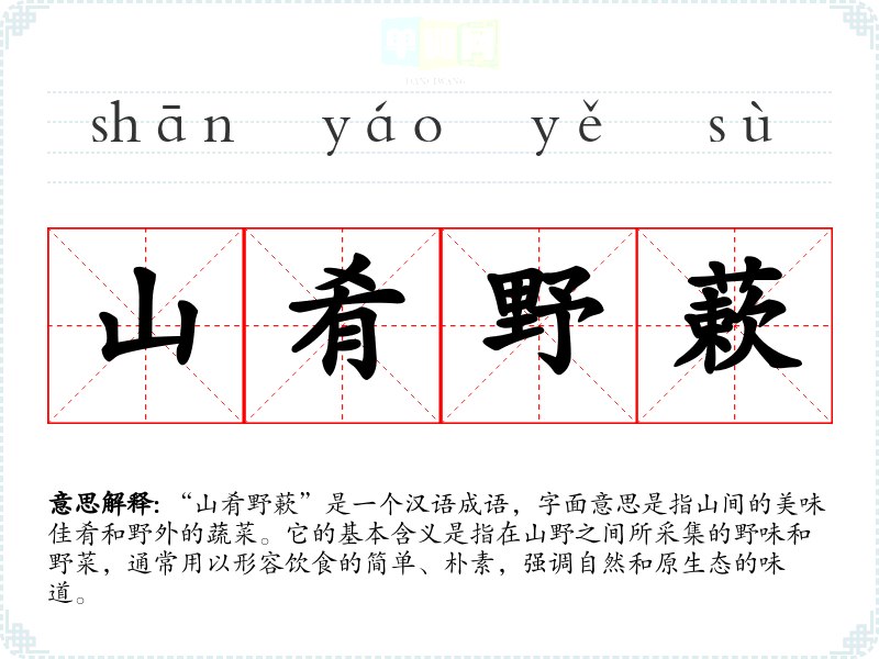 “山肴野蔌”是一个汉语成语,字面意思是指山间的美味佳肴和野外的蔬菜。它的基本含义是指在山野之间所采集的野味和野菜,通常用以形容饮食的简单、朴素,强调自然和原生态的味道。