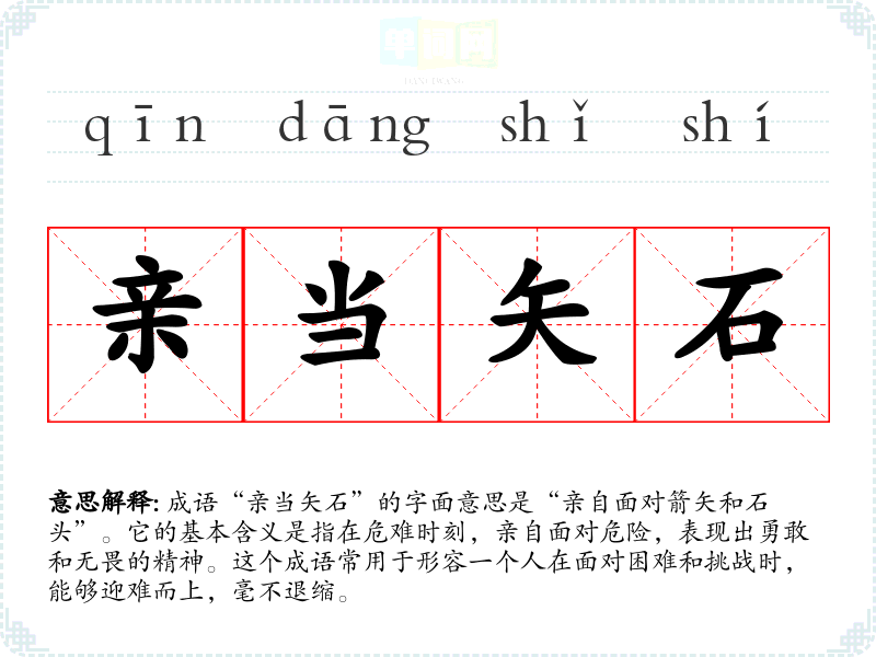 - 日常对话:在朋友之间讨论面对困难的态度时,可以提到“亲当矢石”,鼓励彼此勇敢面对生活中的挑战。