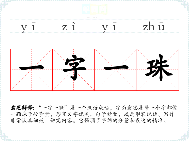 “一字一珠”是一个汉语成语,字面意思是每一个字都像一颗珠子般珍贵,形容文字优美,句子精致,或是形容说话、写作非常认真细致、讲究内容。它强调了字词的分量和表达的精准。