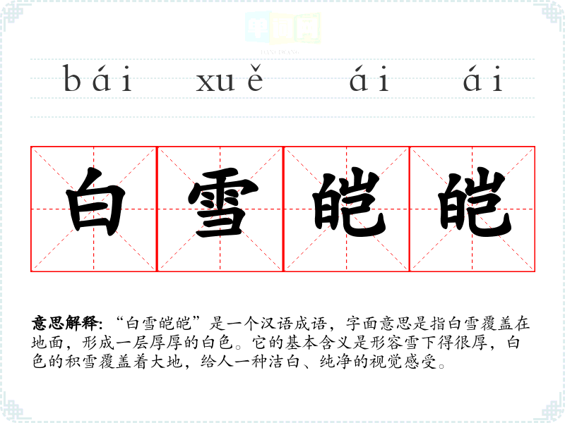 “白雪皑皑”是一个汉语成语,字面意思是指白雪覆盖在地面,形成一层厚厚的白色。它的基本含义是形容雪下得很厚,白色的积雪覆盖着大地,给人一种洁白、纯净的视觉感受。