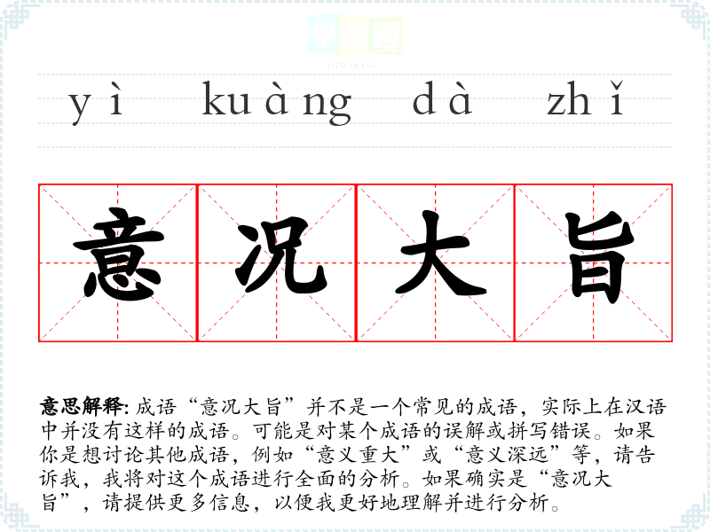 成语“意况大旨”并不是一个常见的成语,实际上在汉语中并没有这样的成语。可能是对某个成语的误解或拼写错误。如果你是想讨论其他成语,例如“意义重大”或“意义深远”等,请告诉我,我将对这个成语进行全面的分析。如果确实是“意况大旨”,请提供更多信息,以便我更好地理解并进行分析。