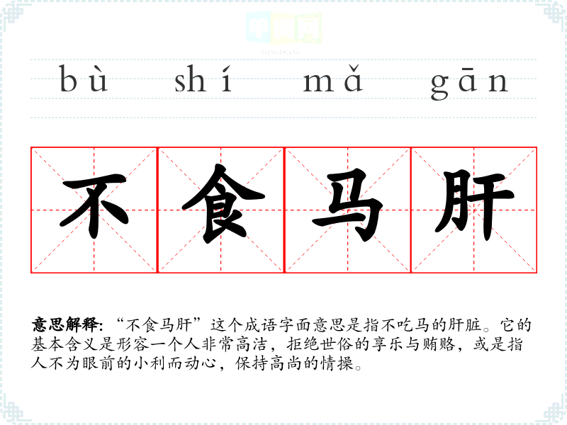 “不食马肝”这个成语字面意思是指不吃马的肝脏。它的基本含义是形容一个人非常高洁,拒绝世俗的享乐与贿赂,或是指人不为眼前的小利而动心,保持高尚的情操。