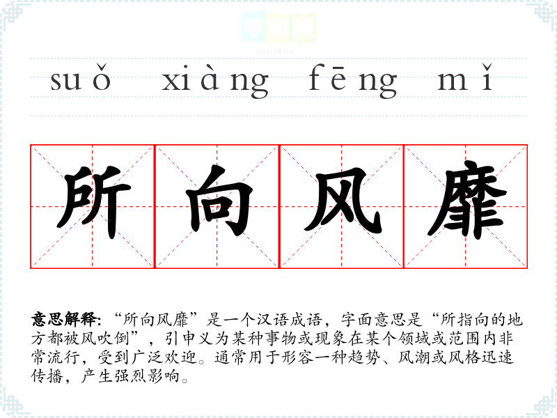 - 文学作品:在描述某种文化现象或流行趋势时,可以用此成语。例如:“这一时尚潮流所向风靡,迅速席卷了整个青年群体。”