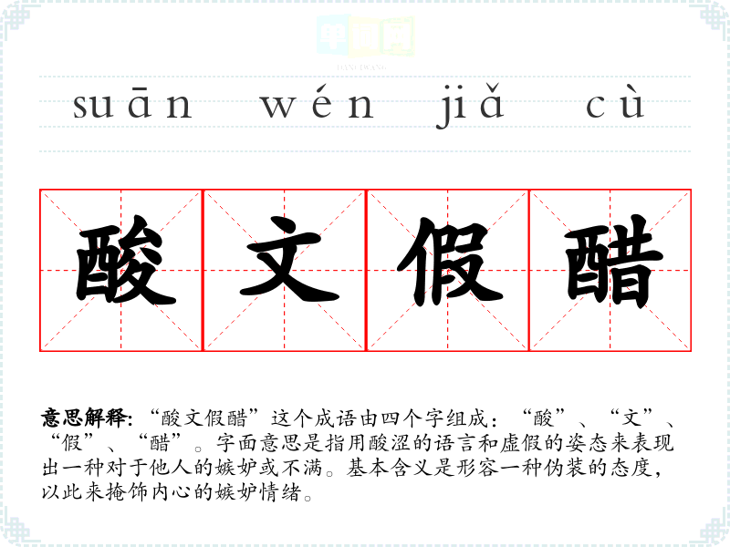 “酸文假醋”这个成语由四个字组成:“酸”、“文”、“假”、“醋”。字面意思是指用酸涩的语言和虚假的姿态来表现出一种对于他人的嫉妒或不满。基本含义是形容一种伪装的态度,以此来掩饰内心的嫉妒情绪。