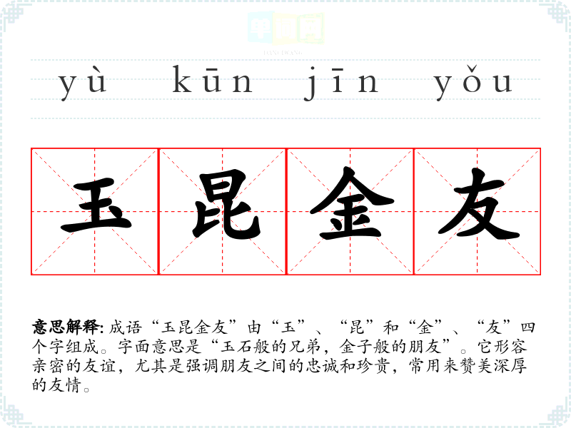 成语“玉昆金友”由“玉”、“昆”和“金”、“友”四个字组成。字面意思是“玉石般的兄弟,金子般的朋友”。它形容亲密的友谊,尤其是强调朋友之间的忠诚和珍贵,常用来赞美深厚的友情。